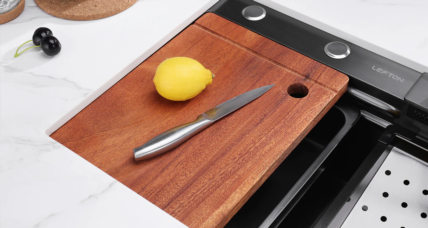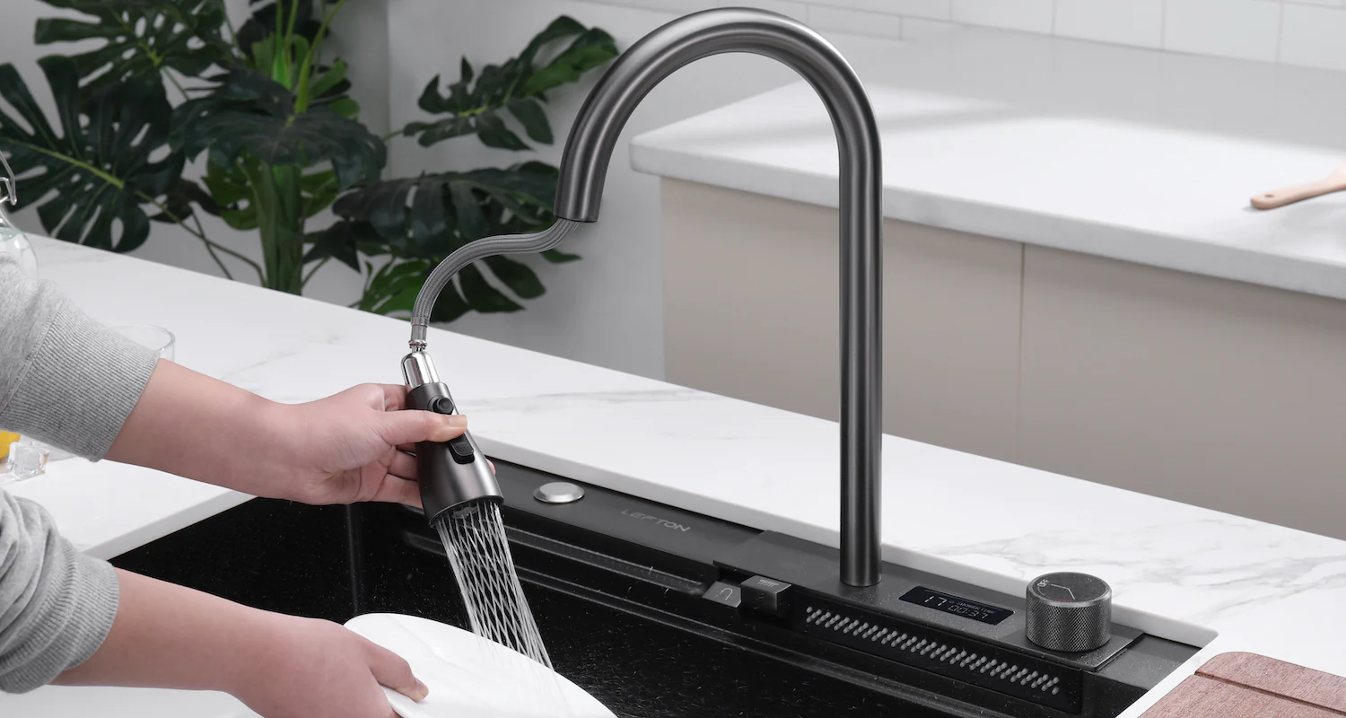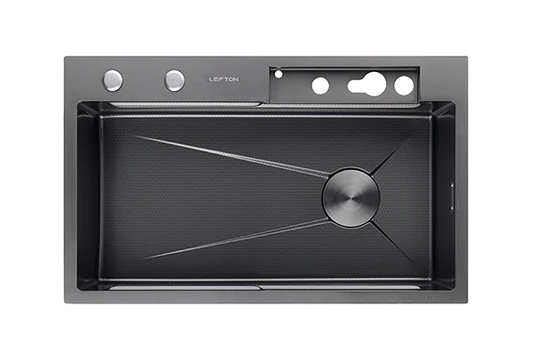 Кухонная мойка Lefton KS2204-2A имеет элегантный внешний вид, устойчива повреждениям. Смеситель имеет 2 режима работы - обычный и водопад. Режимы переключаются кнопками у основания крана. Возможно включение обоих режимов одновременно. В основании смесителя имеется экран, где отображается температура воды в смесителе и длительность включения крана. LED дисплей не требует ни подключения к электрической сети ни батареек. Он работает от встроенной в смеситель миниатюрной турбины, которая генерирует электричество, используя проходящий через нее поток воды. Для Вашего комфорта мойка также оснащена ополаскивателем чашек, дозатором для жидкого мыла, двумя металлическими лотками для мытья продуктов, которые могут перемещаться по мойки по специальным направляющим, массивной деревянной разделочной доской и, наконец, комплектом для подключения мойки к канализации.