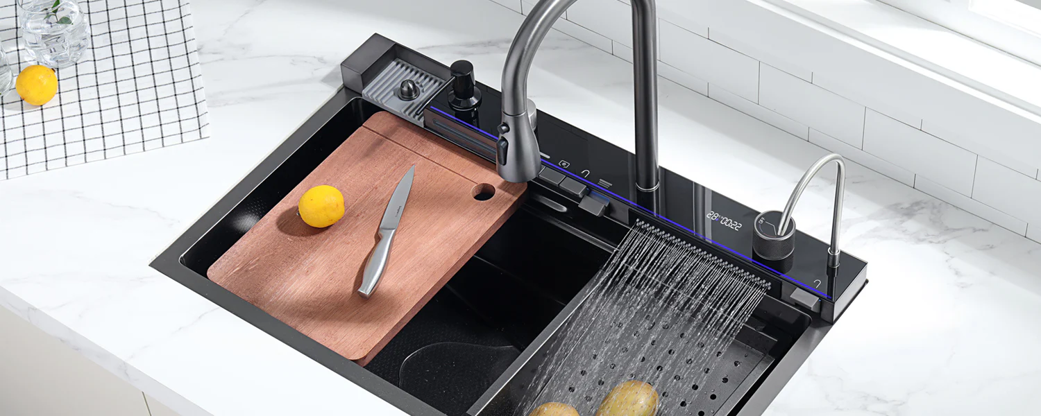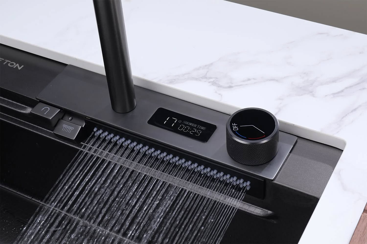 - Смеситель "Водопад" с индикатором температуры и ручкой регулировки температуры и напора воды
